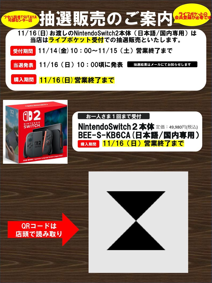 【Switch2抽選販売のお知らせ】 11/16(日)お渡し分のSwitch2本体、マリオカートワールドセットをLivePocketで抽選販売🎮 11/15(土)までに応募、11/16(日)中に購入できる方が対象! 店頭のQRコード付きポスターからご応募ください📷 #フタバ図書TSUTAYA可部センター店 pic.x.com/7uUQtmfnzB