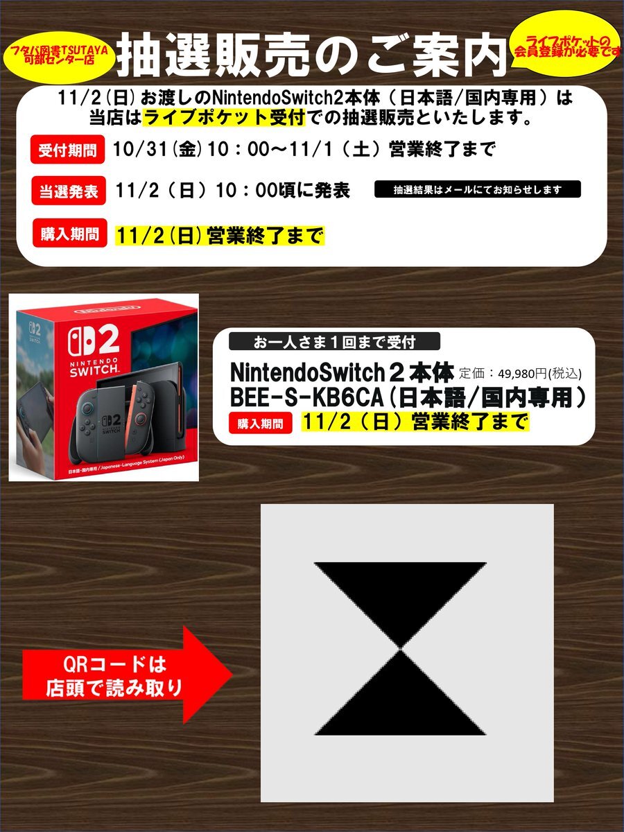 【Switch2抽選販売のお知らせ】 10/26(日)お渡し分のSwitch2本体、マリオカートワールドセットをLivePocketで抽選販売🎮 10/25(土)までに応募、10/26(日)中に購入できる方が対象! 店頭のQRコード付きポスターからご応募ください📷 #フタバ図書TSUTAYA可部センター店 pic.x.com/B9dn5uU9aR