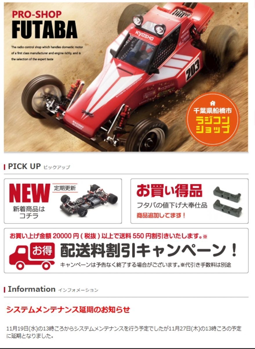 オンラインストアからのお知らせ 11月19日(水)の13時ころからシステムメンテナンスを行います。 メンテナンスの間はお買い物は出来ません。作業が終わり次第再開いたします。 ご迷惑をおかけいたしますがなにとぞよろしくお願いします。 フタバ模型専門店 #proshopfutaba #フタバ模型 pic.x.com/g0uGcH6SnG