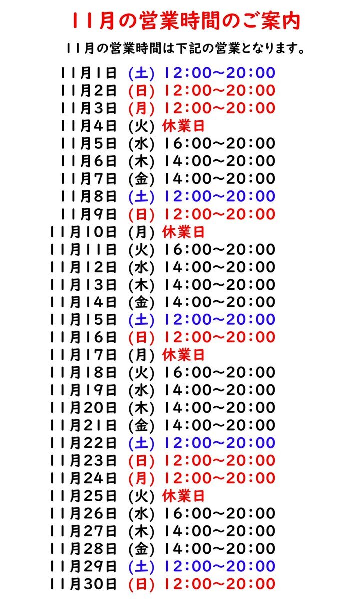 11月の当店の営業スケジュールとなります。 3連休も2回あったりして変則的ではございますが何卒よろしく申し上げます。 #proshopfutaba #フタバ模型 #フタバ模型オンラインストア pic.x.com/znhnyW2WrR