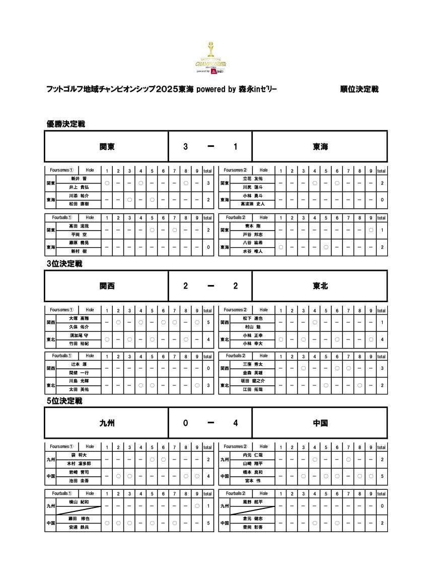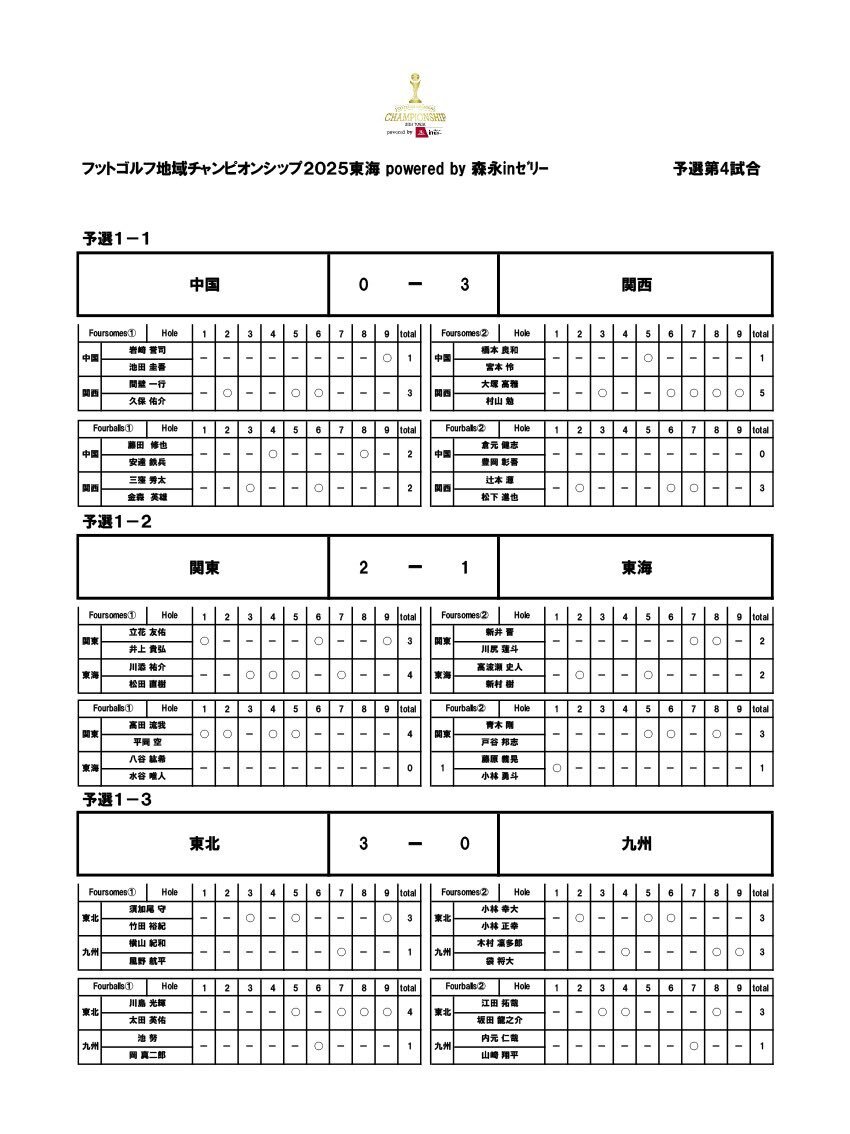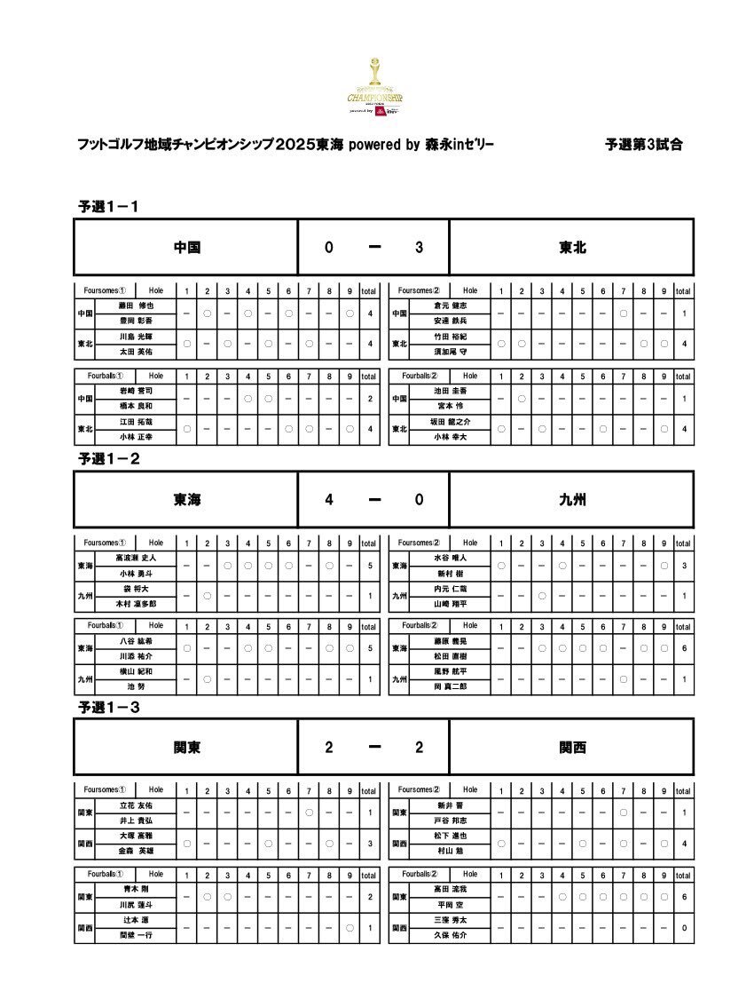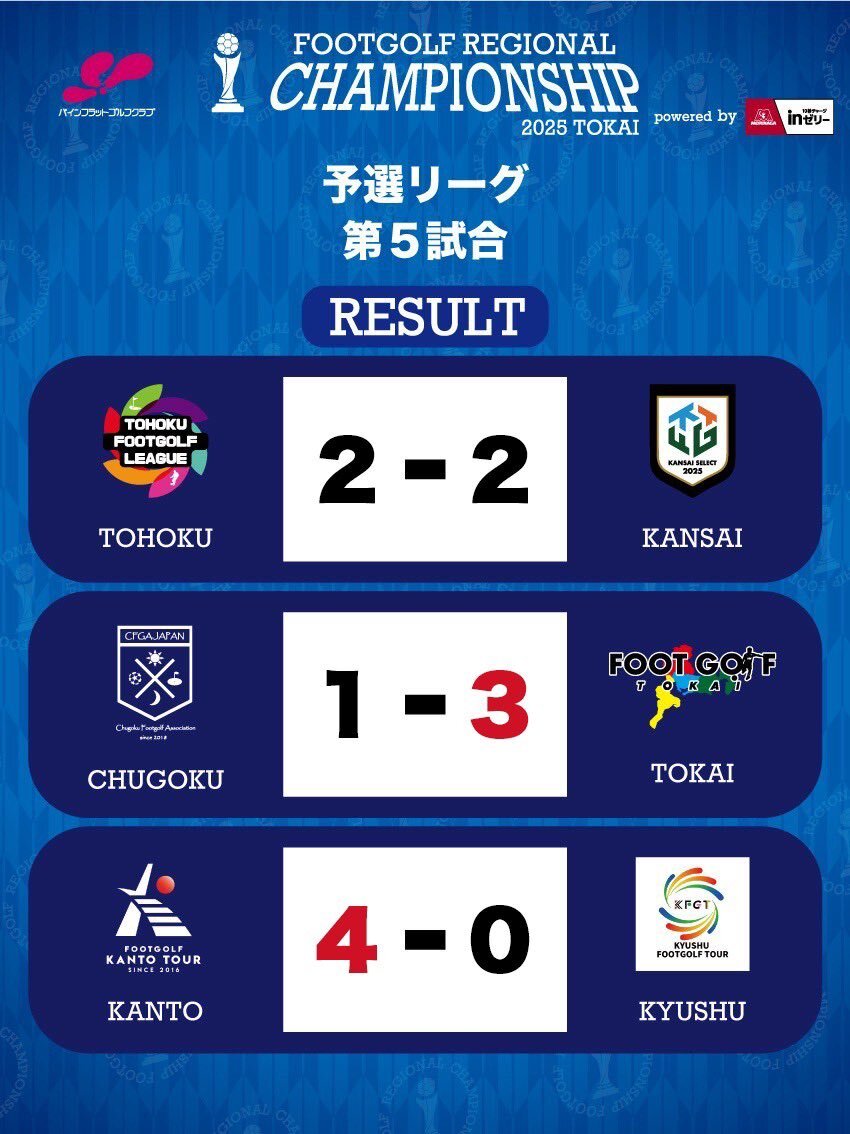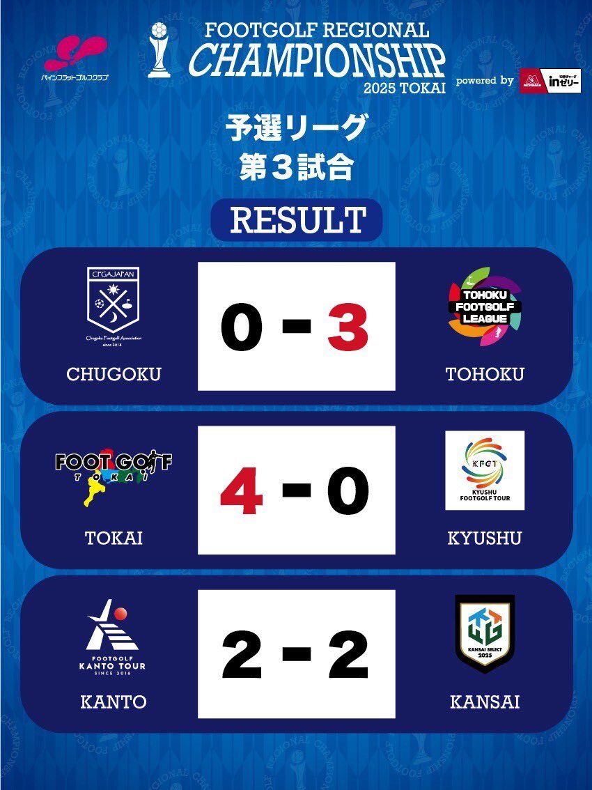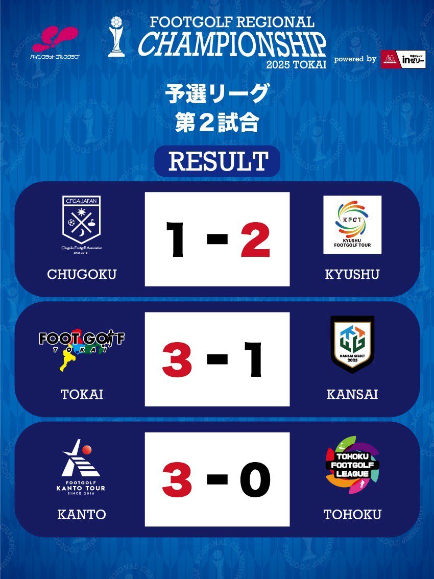 フットゴルフ地域チャンピオンシップ 東海 2025 powered by 森永 inゼリー ✅予選 第2試合 結果 中国 1 - 2 九州 東海 3 - 1 関西 関東 3 - 0 東北 #フットゴルフ