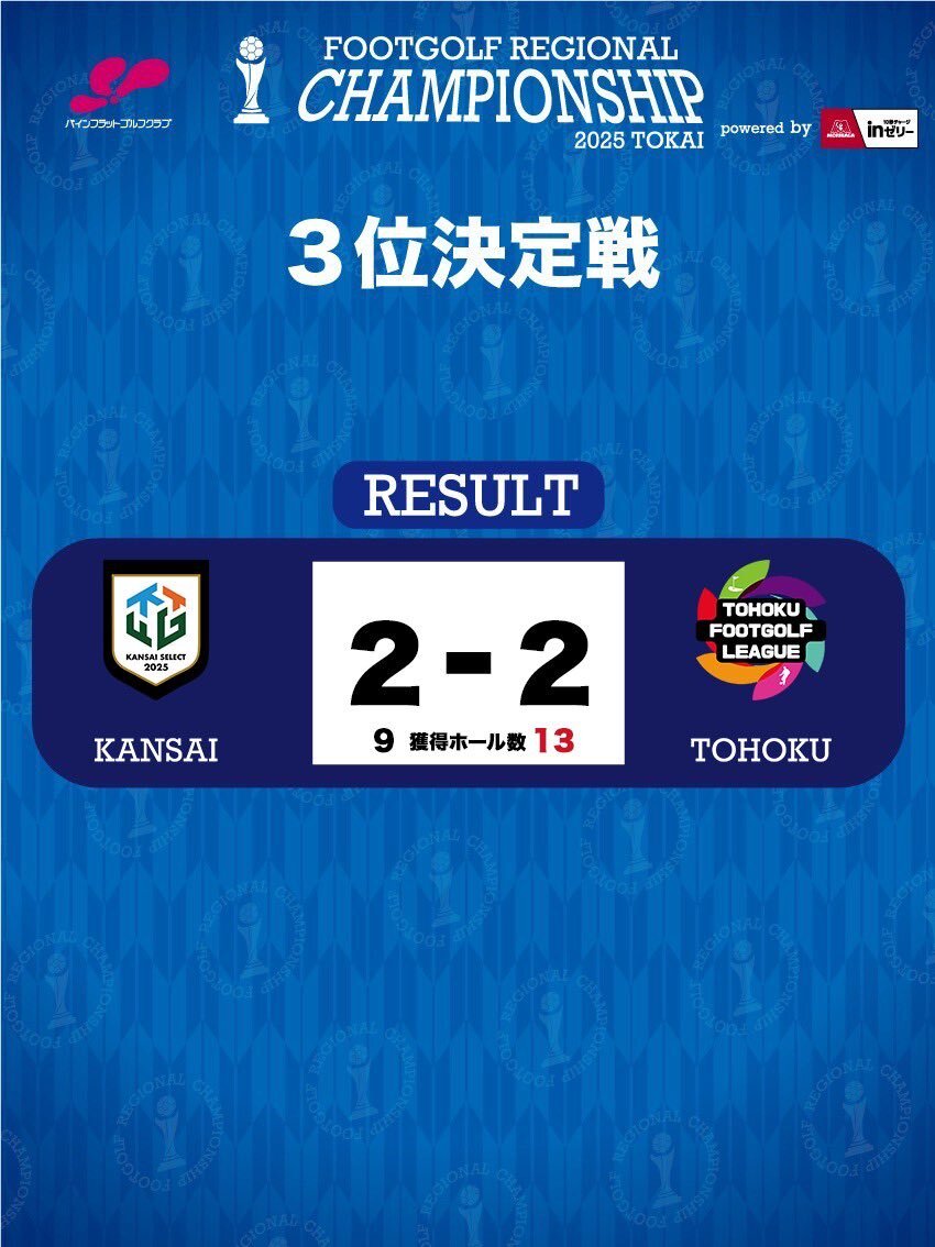 フットゴルフ地域チャンピオンシップ東海2025powered by 森永inゼリー ✅順位決定戦 【決勝戦】 関東 3 - 1 東海 【3位決定戦】 関西 2 - 2 東北 ( 9 獲得ホール数 13 ) 【5位・6位決定戦】 九州 0 - 4 中国 #フットゴルフ