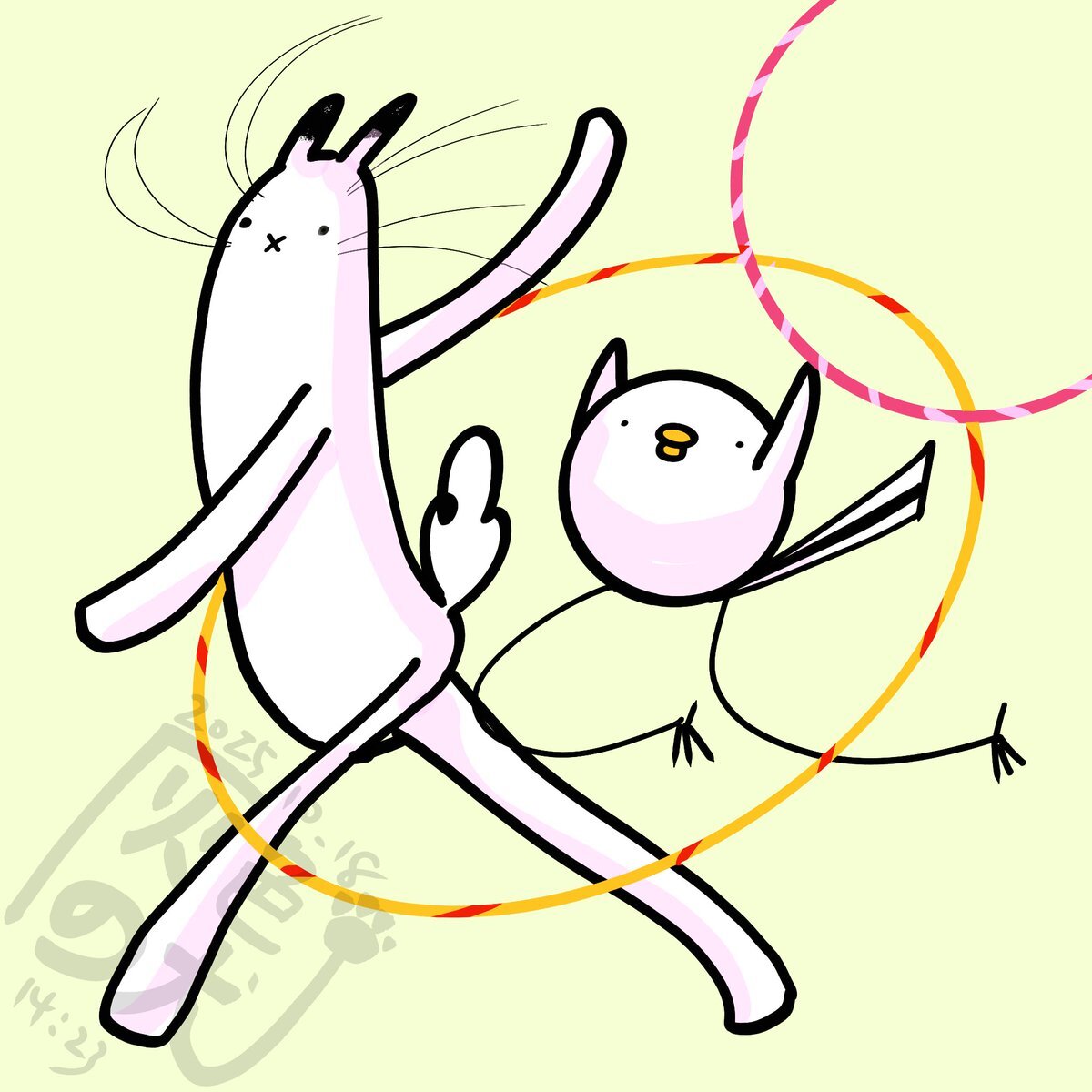 #フラフープ記念日 なので、フラフープをするねこくんとうさぎちゃんを描きました!! スイスイ回すうさぎちゃんを見て何とも言えない気持ちになるねこくんでした🏃♀️ #イラスト #一日一絵 pic.x.com/yw7Vfpmucu