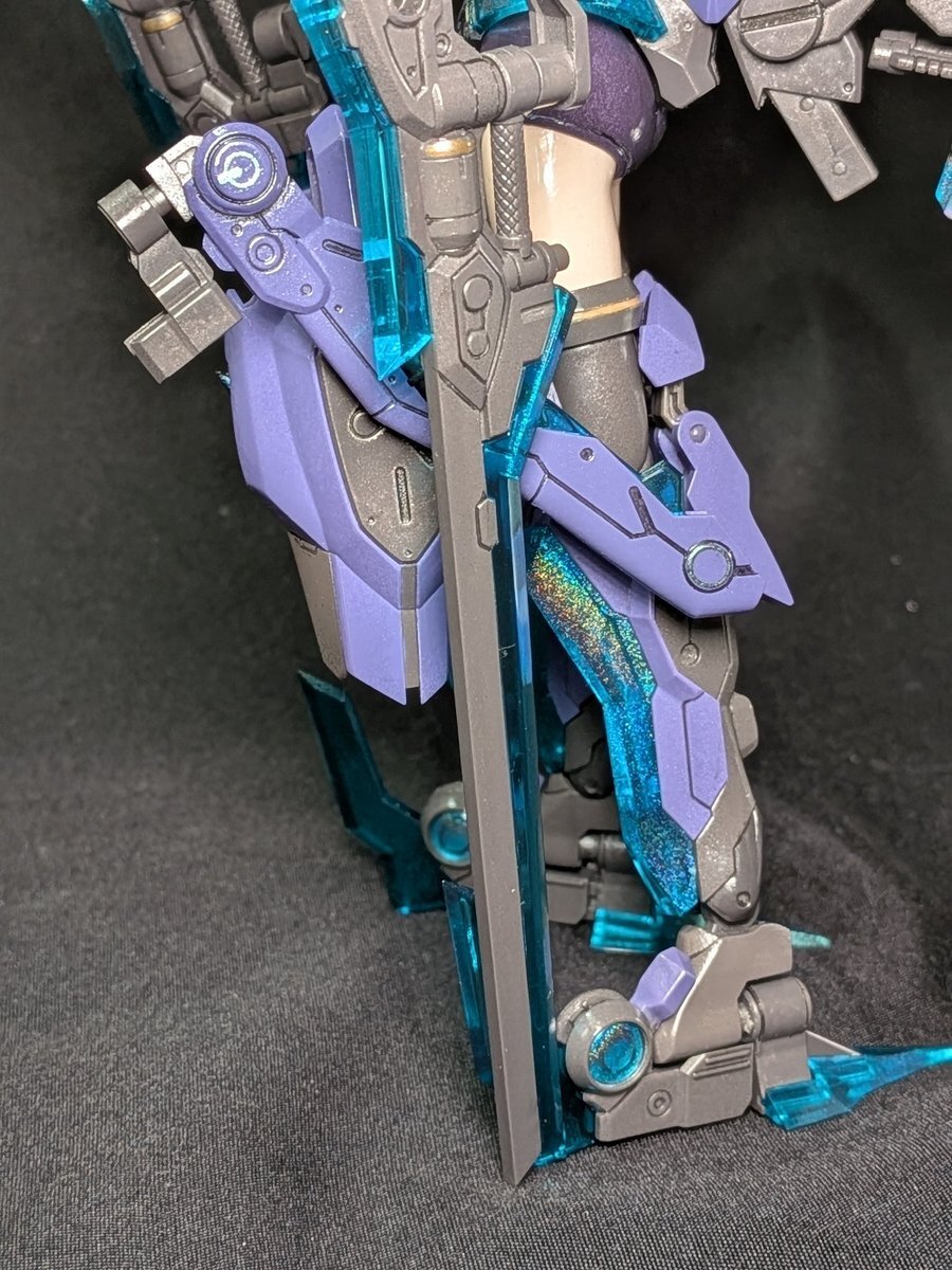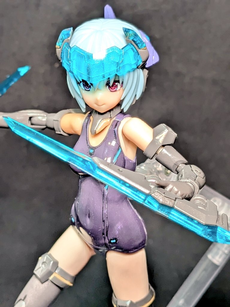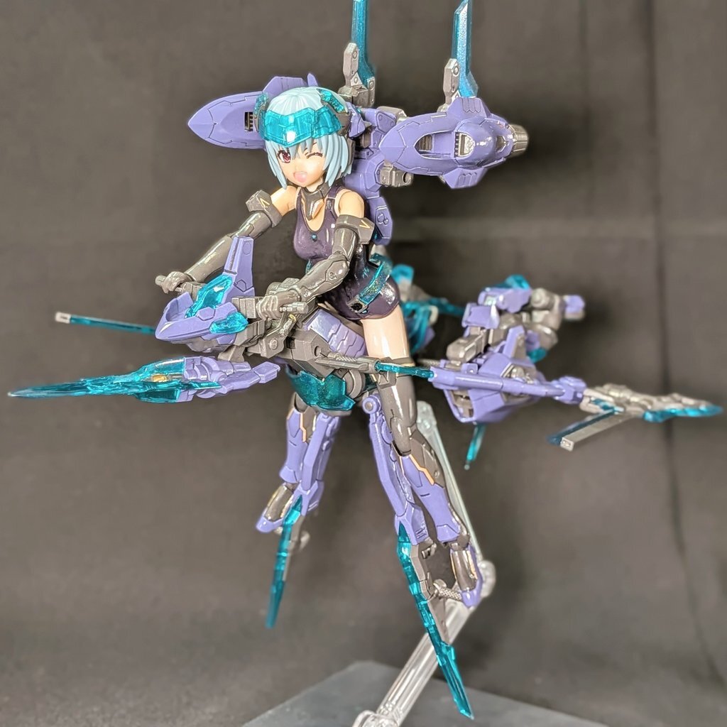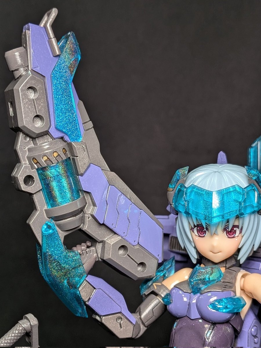 ツヤテカ塗装は撮影ムズいっすね…質感でてるかな? クリアパーツはガイアノーツのプリズムホログラムで偏光ぽくしてみました あと青フレズは本来横ちちのワンポイント(写真水色ライン)入ってないのですが、妹達と統一感出したくて追加してます #フレームアームズガール pic.x.com/Px7FnZprOX