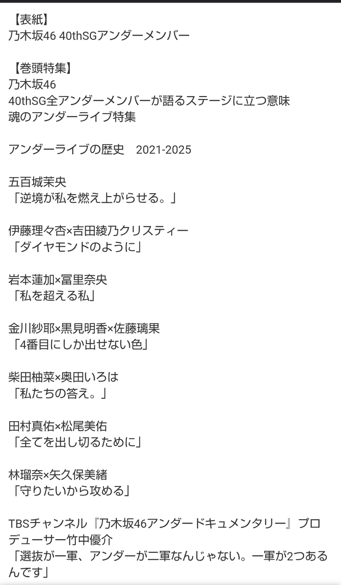 アンダラ特集、メンバーの想い、裏話も竹中Pやライターさんのお話も凄く良くて読み応えがありました!乃木坂好きな人みんなに読んで欲しいわ、これは。 読んでて泣いちゃったけど😭 アンダラ3日目、更に楽しみになりました!BUBKAさん、ありがとう😊 #ブブカ魂のアンダーライブ特集 pic.x.com/2fLE84ISqe