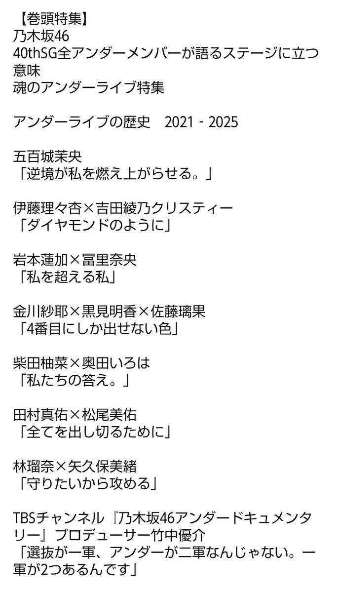 とても読み応えのある内容だった。 本誌のおかげで自分の考えが間違いじゃないとも思えた。 ずっと思ってた。やはり乃木坂46は全員が一度はアンダーを経験するべきだ。選抜メンバーのパフォーマンスにみる「足りない」がアンダーで補強されるだろう。 #ブブカ魂のアンダーライブ特集 x.com/BUBKA_henshuub…
