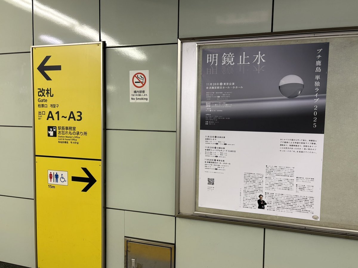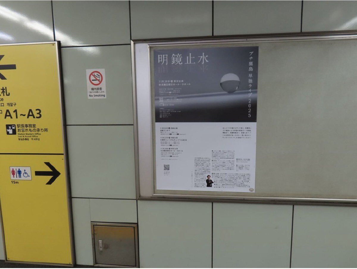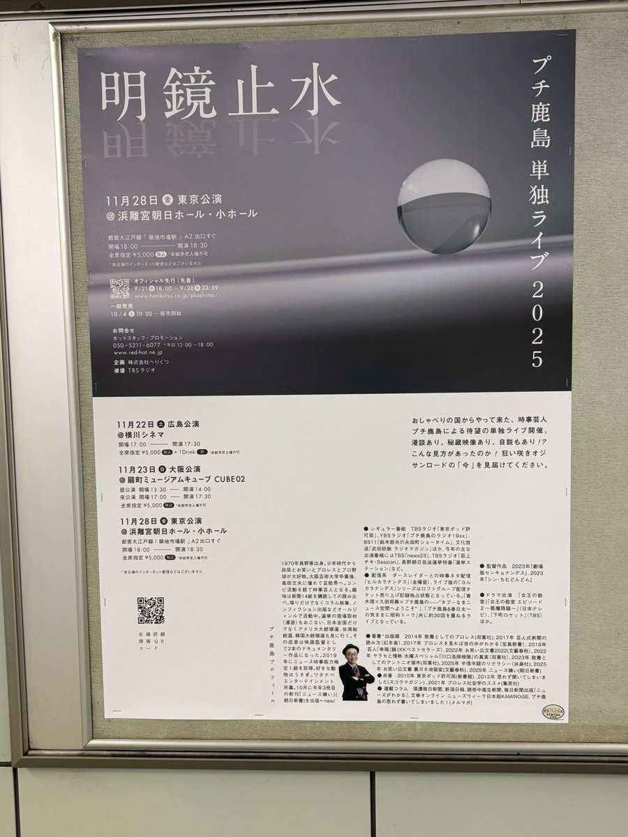 今日から浜離宮朝日ホールのある「築地市場駅」(大江戸線)にプチ鹿島単独ライブ『明鏡止水』ポスターが貼られています 前売は完売ですが、反響大につき当日券出す方向です!ライブ情報→herikutsu.co.jp/pkashima/