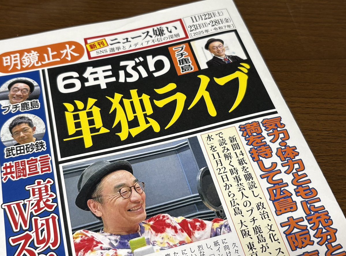 せっかくなのでご来場の皆様にライブと合わせて楽しんでいただけるようにタブロイド作りました。会場で配布します! #明鏡止水2025 #プチ鹿島 pic.x.com/MfLAwdUk5e x.com/herikutsuinc/s…
