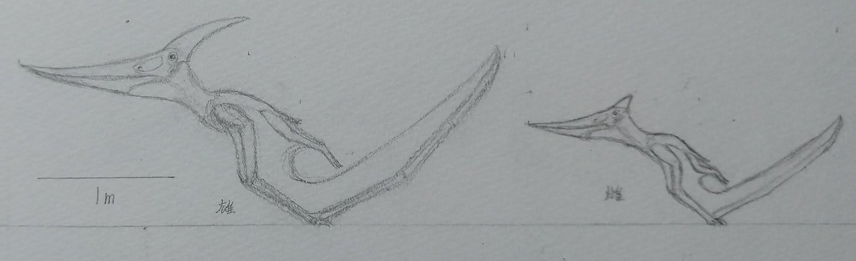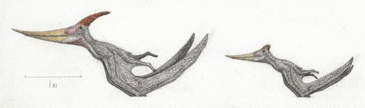 #プテラノドン ・ロンギケプス #Pteranodon longiceps 左︰オス、右︰メス 2022年にJPⅢ放送記念で描き始め、2023年には色塗りをある程度終わらせ、長いことその状態で運用していたが、実は完全には完成していなかった。 思った以上に胴体が小さく、特にオスは上嘴の長さが目立つ。 pic.x.com/3eWLs1vXPo x.com/Spino_Rin/stat…
