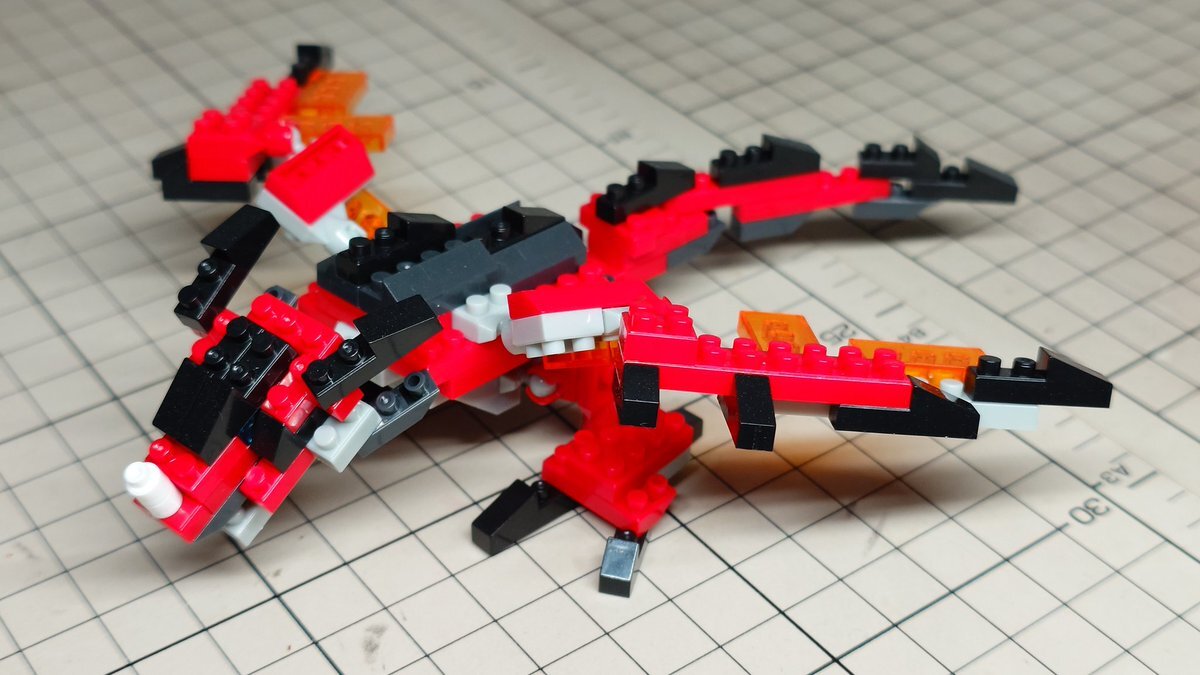 ダイソーのプチブロックのドラゴン。 二本脚なのでワイバーンですな。 デフォルメのためか、写真で魅力を伝えるのは難しいのだけど、現物はなかなか良いですぞ。 ジョイントが10組収穫できるのと、キャッチーな配色なので、オリジナル作品の部品取りにもいいかもね #ダイソー #プチブロック