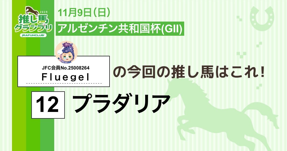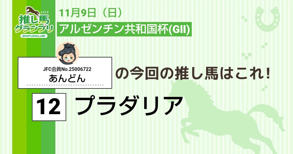 今週の #推し馬グランプリ 対象レースは #アルゼンチン共和国杯 私の予想は #プラダリア ! 予想を的中させて、抽選で素敵な賞品がもらえるキャンペーンに応募しよう! #JRAFUNCLUB #JRAFUN ↓推し馬グランプリはコチラ↓ club.jra-fun.jp/oshiuma/ pic.x.com/8LlKcnx48R