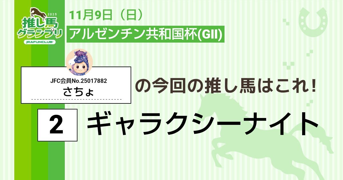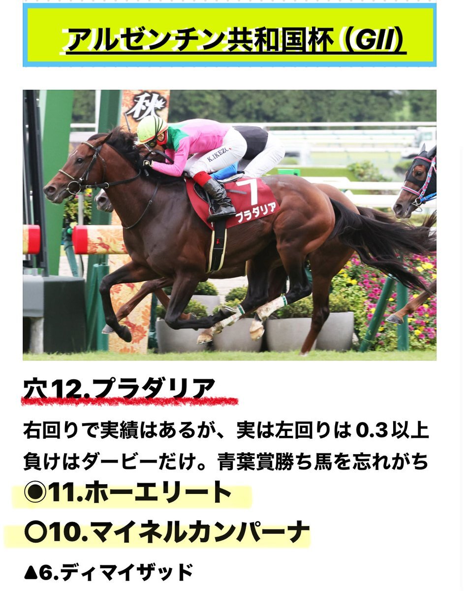 今週の #推し馬グランプリ 対象レースは #アルゼンチン共和国杯 私の予想は #プラダリア ! 予想を的中させて、抽選で素敵な賞品がもらえるキャンペーンに応募しよう! #JRAFUNCLUB #JRAFUN ↓推し馬グランプリはコチラ↓ club.jra-fun.jp/oshiuma/ pic.x.com/lQkPZb47iD