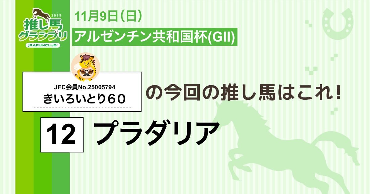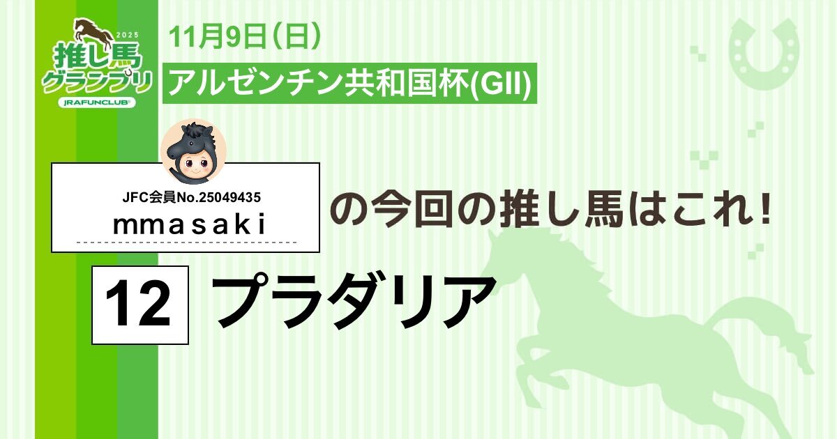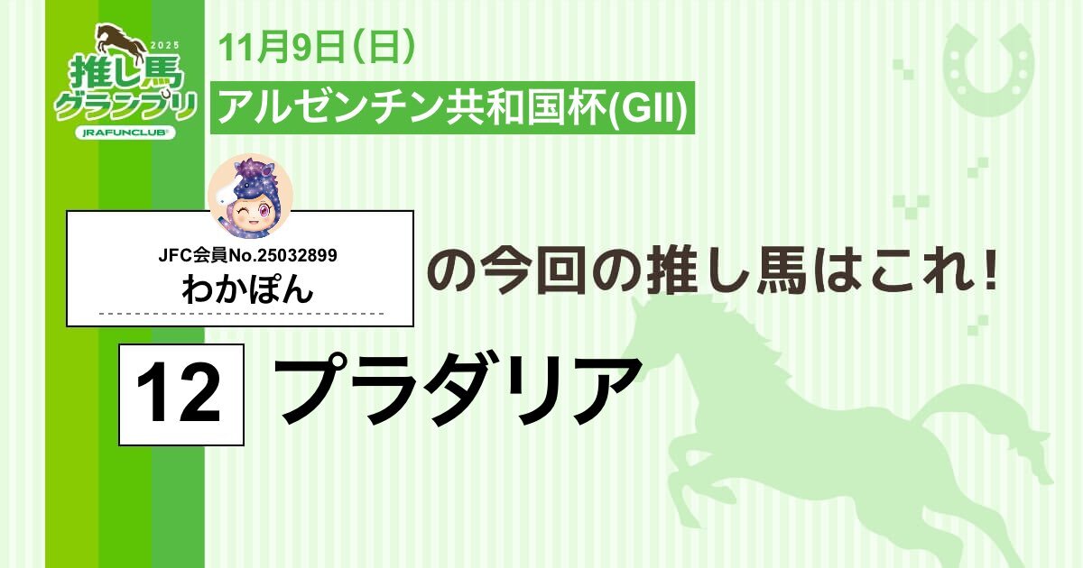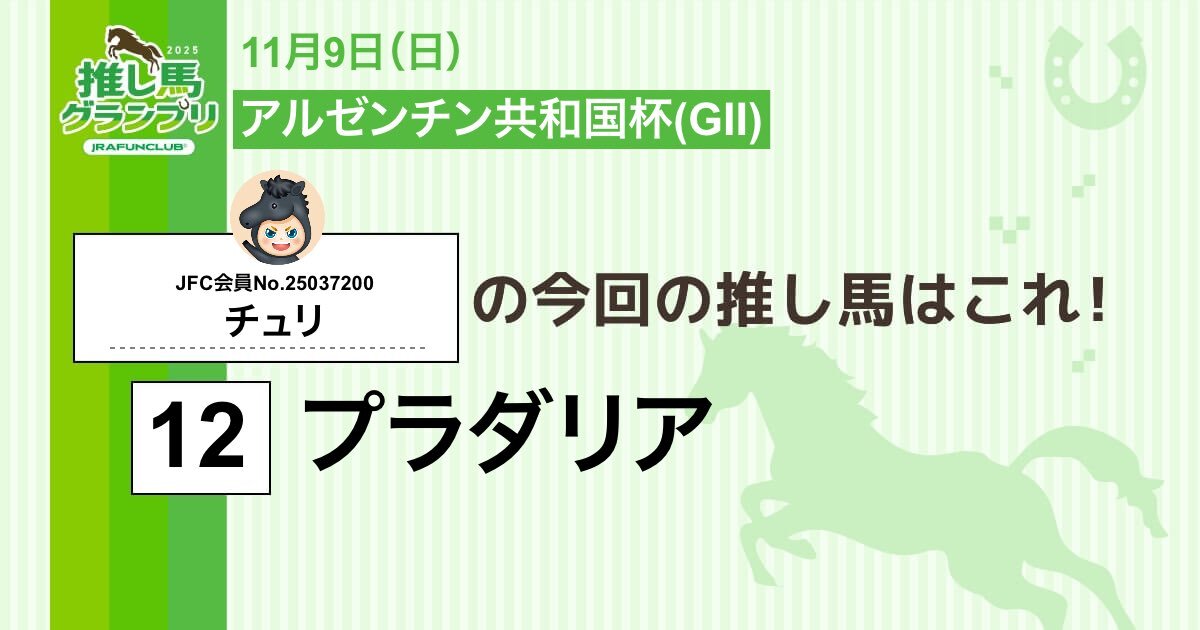 今週の #推し馬グランプリ 対象レースは #アルゼンチン共和国杯 私の予想は #プラダリア ! 予想を的中させて、抽選で素敵な賞品がもらえるキャンペーンに応募しよう! #JRAFUNCLUB #JRAFUN ↓推し馬グランプリはコチラ↓ club.jra-fun.jp/oshiuma/ pic.x.com/b0Kl0yYEJr