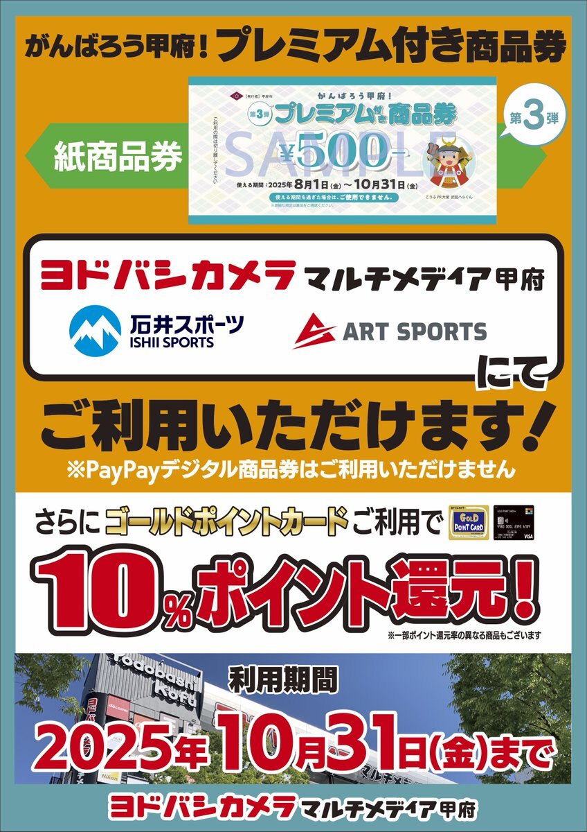 【#がんばろう甲府!プレミアム付き商品券】 #プレミアム付き商品券 紙商品券が #ヨドバシ甲府 でご利用できます❗️ もちろん、ゴールドポイントも10%還元❗️ ぜひこの機会に お得なプレミアム付き商品券にて お買い物をお楽しみください❗️💁 🏬yodobashi.com/ec/store/0055/ #甲府市