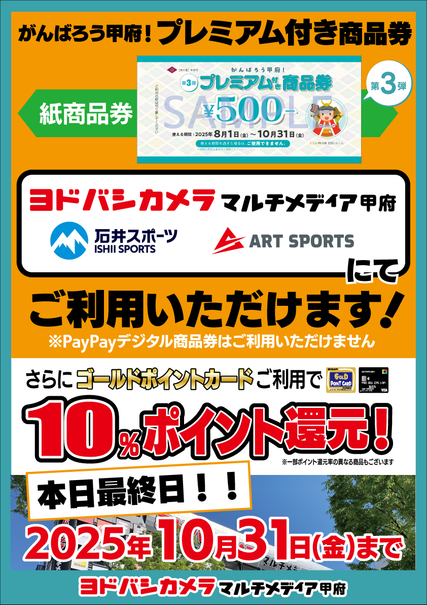 【本日最終日❗️📣】 #がんばろう甲府 !#プレミアム付き商品券 は本日が利用期限最終日です❗️ まだ使いきれずお手元にあるお客様、ぜひ #ヨドバシ甲府 にてお買い物ください♪ もちろんゴールドポイント10%還元❗️ ぜひこの機会をお見逃しなくご利用ください💁 pic.x.com/uTYTPZauOD x.com/yodobashi_kohu…