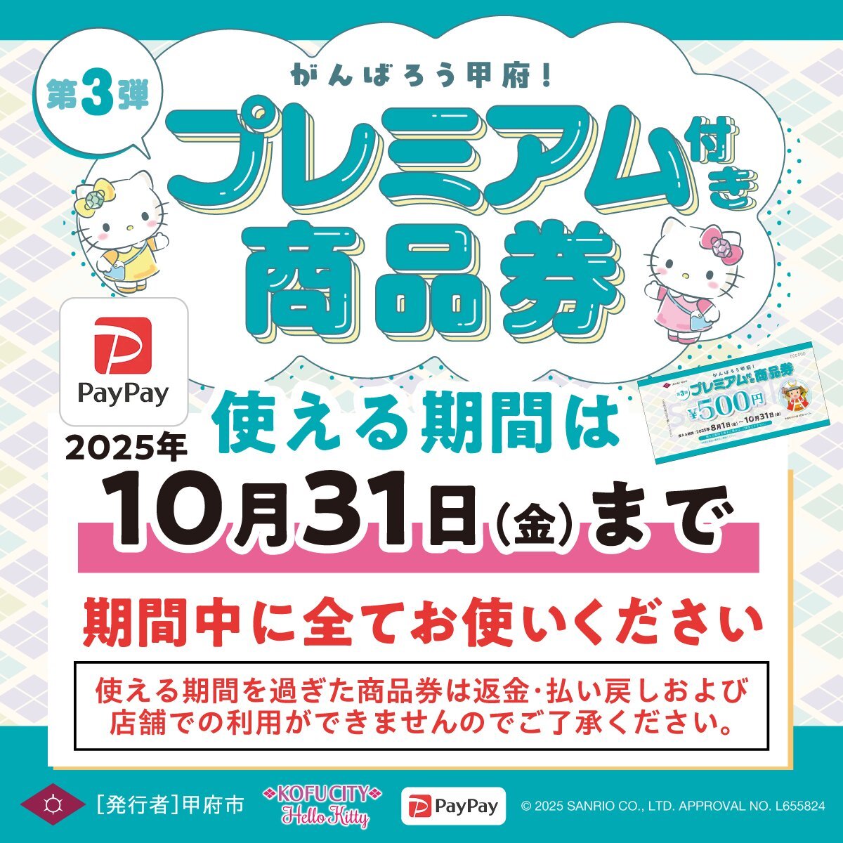 ==\☆#甲府市 からのお知らせです☆/== #プレミアム付き商品券 の 使える期間は本日10/31までです!! 使い忘れのないようにご注意ください🙏 ===================== kofu-premium.jp #甲府 #kofu pic.x.com/6ESj87bamm