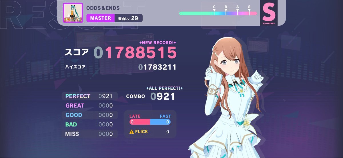 335曲目 ODDS&ENDS (Master29) 🌈 親指ALL PERFECT!!!🌈 昔に1グレフルコンまで詰めてたやつ! やっと決まった!! #プロセカ #プロセカ成長記録 pic.x.com/R75zaDE1Fx