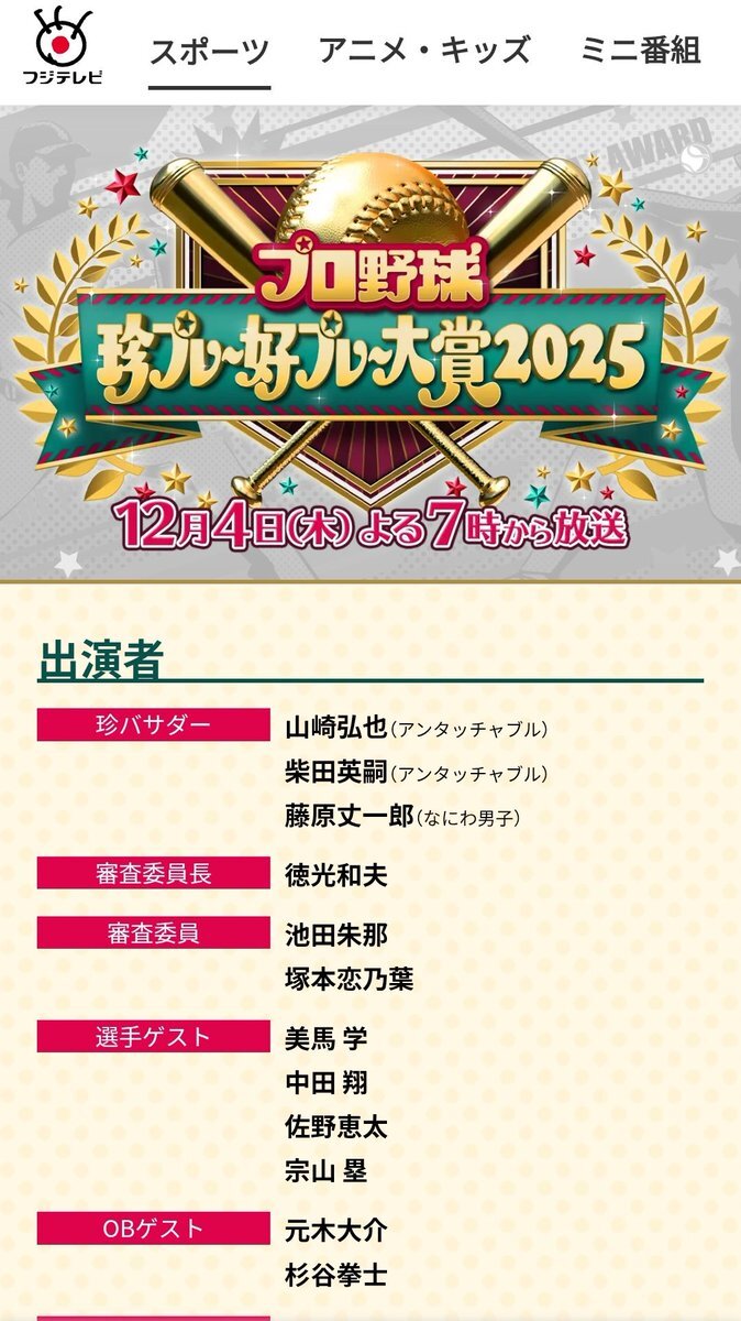 fujitv.co.jp/fujitv/news/20… #プロ野球珍プレー好プレー大賞2025 12月4日 19時~21時54分 毎年O.A楽しみにしてます⚾️ スタジオゲストに美馬くんと 宗山くんも出る! これは、楽しみだな〜😊