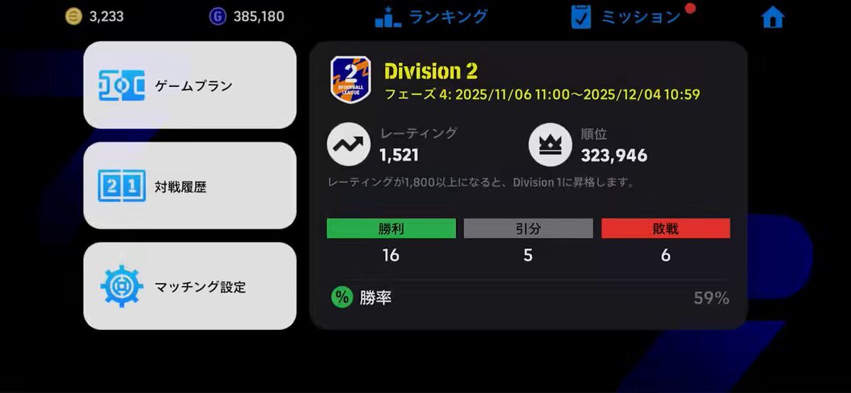 今フェーズ2度目のハットトリックから3連勝でDiv2昇格⤴️ 開幕2連勝からスタートして連勝はストップしてしまったけど勝率良い感じでDiv2昇格しました! 10連勝目指して引き続き頑張ります💪 #eFootball2026 #イーフト #Hazard #アザール x.com/hazarddegozard…