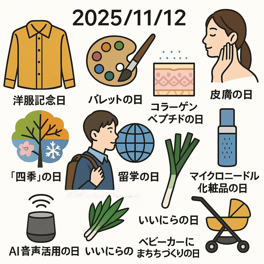 今日は何の日? 11月12日 ・洋服記念日 ・パレットの日 ・皮膚の日 ・コラーゲンペプチドの日 ・「四季」の日 ・留学の日 ・AI音声活用の日 ・いいにらの日 ・ベビーカーにやさしいまちづくりの日 ・マイクロニードル化粧品の日 ・ジョン万次郎忌 ・心平忌 AIArt AIイラスト ChatGPT x.com/Kouhei_Yamamot…