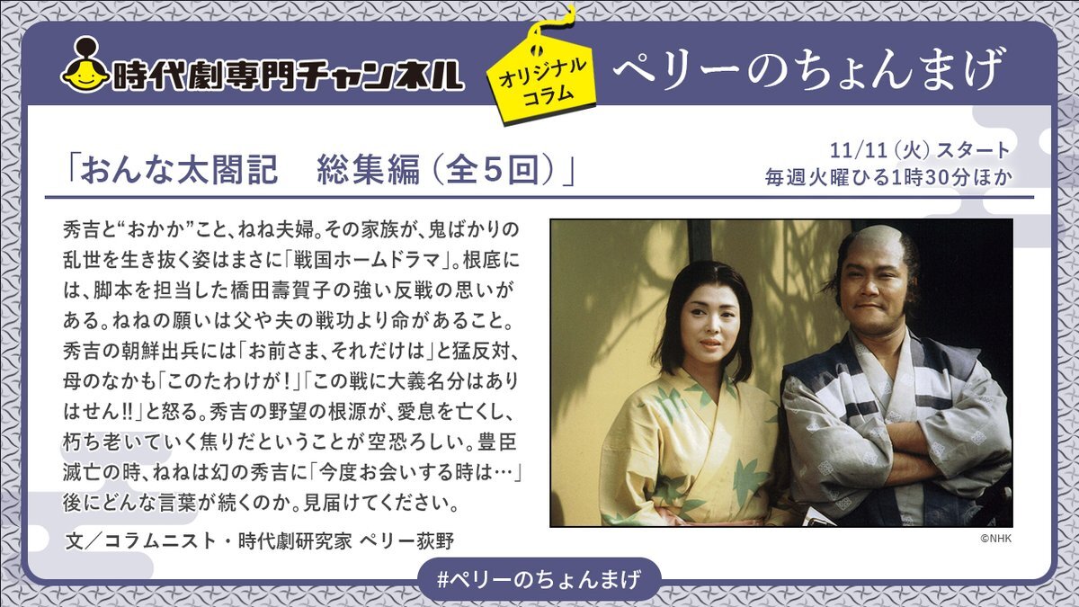 #時代劇専門チャンネル オリジナルコラム 【#ペリーのちょんまげ】 \ ペリー荻野が語るオススメの1本は… 「#おんな太閤記 総集編」 📺11/11㊋スタート 毎週ひる1時30分ほか 秀吉とねね、二人の夫婦関係を軸に 激動の時代を描く🔥 #佐久間良子 #西田敏行 jidaigeki.com/osusume/nishid… pic.x.com/788i68lF3p