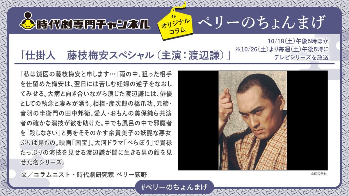 #時代劇専門チャンネル オリジナルコラム 【#ペリーのちょんまげ】 \ ペリー荻野が語るオススメの1本は 「#仕掛人 藤枝梅安スペシャル(主演:渡辺謙)」 📺10/18㊏午後5時ほか 昼は腕利きの鍼医者、 夜は凄腕の仕掛人 異なる顔を持つ#藤枝梅安 を #渡辺謙 が熱演‼ jidaigeki.com/program/detail… pic.x.com/Ee0snzfS4x