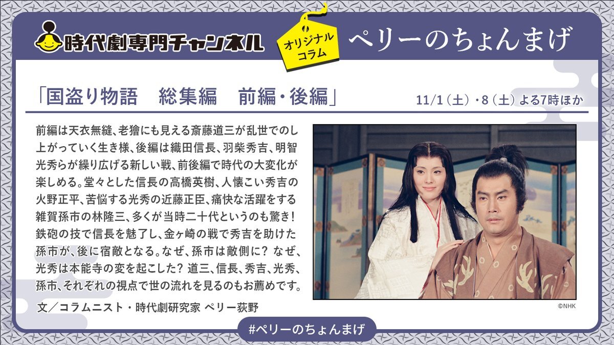 #時代劇専門チャンネル オリジナルコラム 【#ペリーのちょんまげ】 \ ペリー荻野が語るオススメの1本は… 「#国盗り物語 総集編」 📺11/1㊏8㊏よる7時ほか #斎藤道三 #織田信長 #明智光秀 下剋上の乱世を生きた人々葛藤を 3人の武将を中心に大迫力で描く🔥 jidaigeki.com/program/detail… pic.x.com/xs6UX671ft