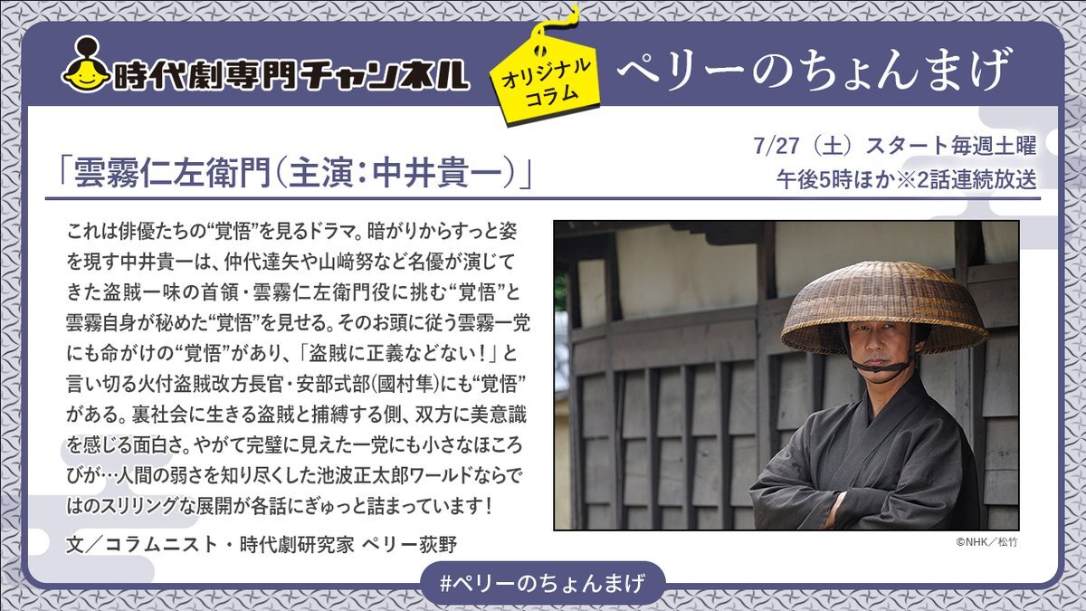 #時代劇専門チャンネル オリジナルコラム 【#ペリーのちょんまげ】 \ ペリー荻野が語るオススメの1本は 「#雲霧仁左衛門(主演:#中井貴一)」 📺7/27㊏スタート毎週㊏午後5時 俳優たちの“覚悟”を見るドラマ👀 #池波正太郎 作品ならではの スリリングな展開にも注目✨ jidaigeki.com/program/detail… pic.x.com/g2fgcN2ETc