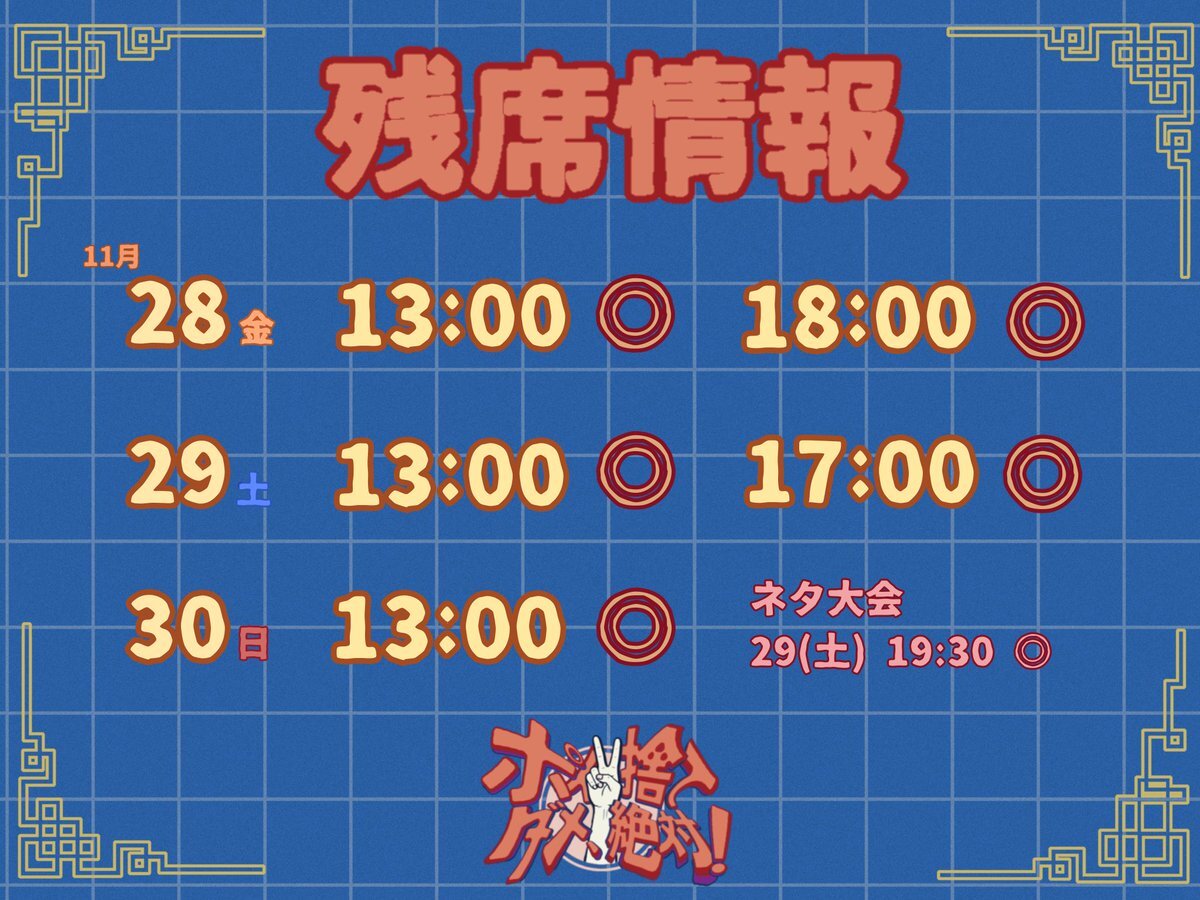 #秋研2025#ポイ捨てダメ絶対! 』 📢 残席情報 29日(土) 17:00 売切れ すごいスピードでお席が埋まっています🏃🔥 ご検討中の方はお早めのご予約をお勧めいたします。 予約URL▼ ticket.corich.jp/apply/405798/ ⚠️ネタ大会は別途ご予約が必要です。 pic.x.com/nE6YGnOIr7