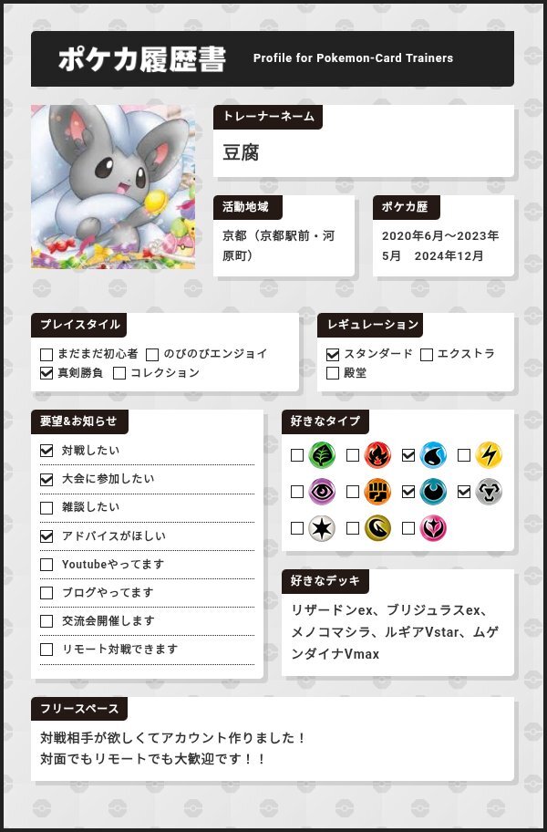 京都で活動している豆腐です CL愛知に参加するけど一緒に対戦する人がいないのでTwitter始めました 復帰勢のシニアですがよろしくお願いします!! #ポケカ #ポケカ履歴書 #ポケカ好きと繋がりたい pic.x.com/FIKrtBwMPF