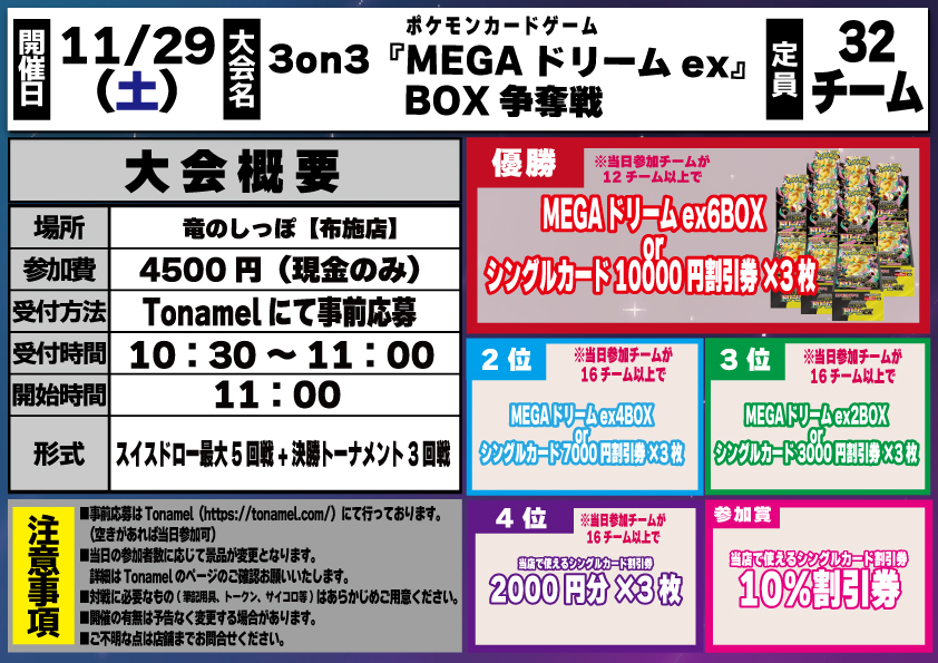 【大会情報📢】#ポケモンカード #ポケカ 11月開催のポケカ3on3の詳細を公開します✨✨ ----------------------------------------------------------- ・11/29(土) 11:00~ 『ポケカ3on3 MEGAドリームex BOX争奪戦』 事前受付を明日 11/13(木)20:00~開始します🌟