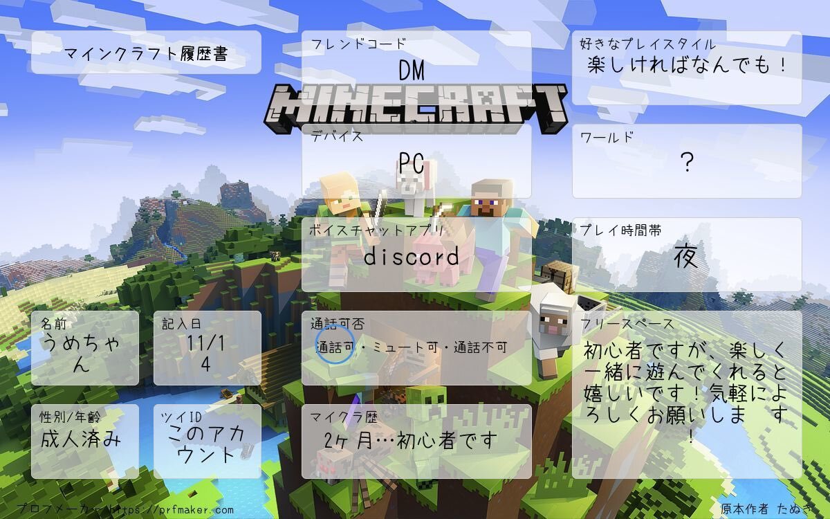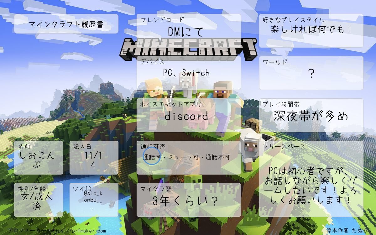 マイクラやってる方と仲良くなりたいです!よろしくお願いします! #マイクラ #マイクラ好きと繋がりたい #マイクラフレンド募集 #マインクラフト #マイクラ自己紹介カード pic.x.com/gdOadciNli