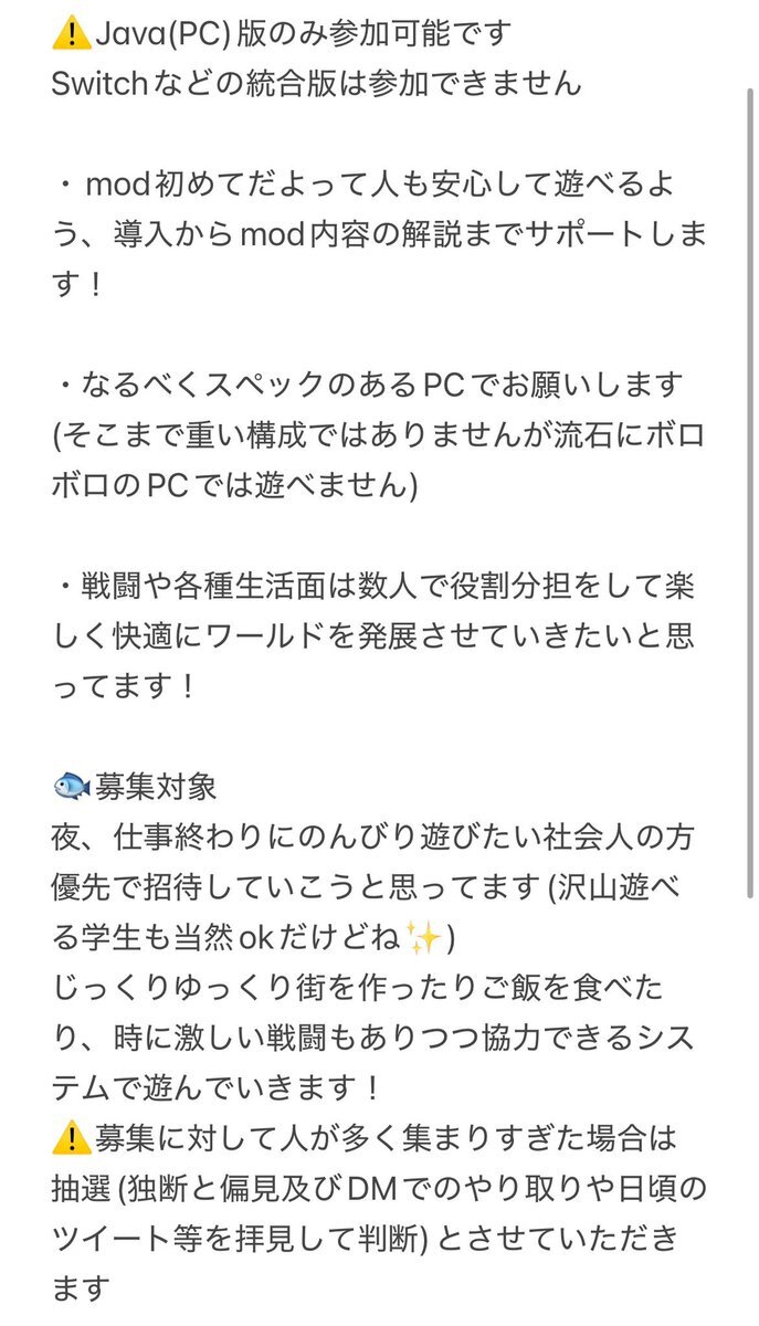 スタートの日付け間違ってました💦 本日土曜日の夜から開始🌷 女性の方歓迎! MODをサクッとやって終わりではなく、長期的に運営します🌼 参加する前にいくつか質問させていただきますのでご了承ください🙇♀️ 参加希望の方はリプorDMまで! #マイクラ募集 #マイクラJava #マイクラフレンド募集 pic.x.com/8sRsM3qsQZ