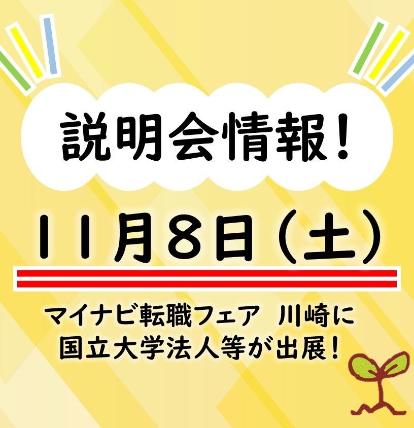 📣(転職希望者向け)説明会情報📣 11月8日(土)11:00~17:00 マイナビ転職主催の「#マイナビ転職フェア」に国立大学法人等が出展します! ▼詳細はこちら tenshoku.mynavi.jp/event/kanagawa… #転職活動 pic.x.com/APo88pSxEG