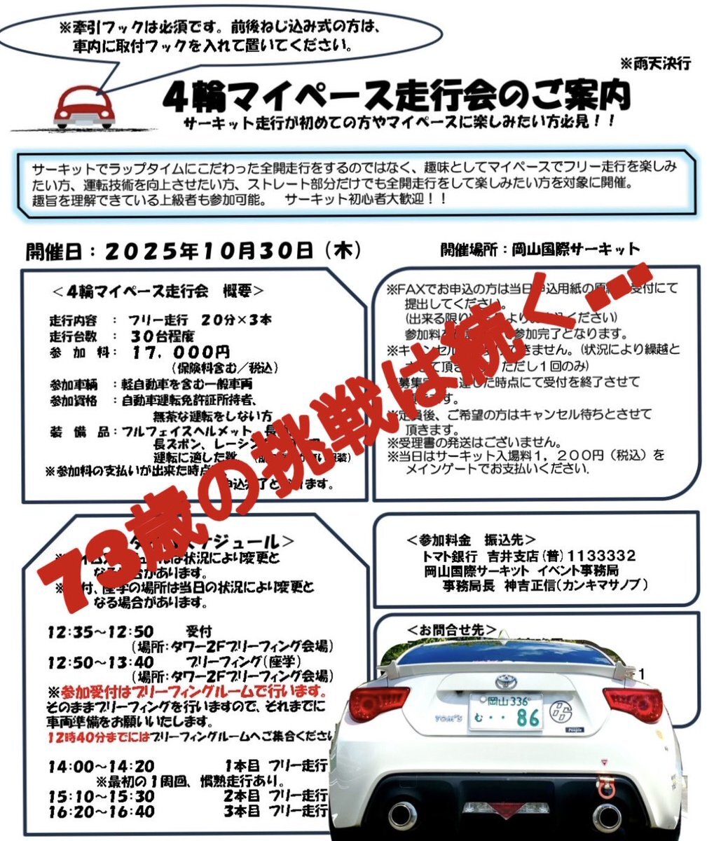 12月の岡国出走決まりました‼️ 1月のデビュー以来一年、集大成として全力で目標達成を目指します(^ー^)ノ 敵は☃️❗️寒波来るなよ〜〜 #86BRZ #岡山国際サーキット #マイペース走行会 #NA&AT pic.x.com/hdXYIPWvT0