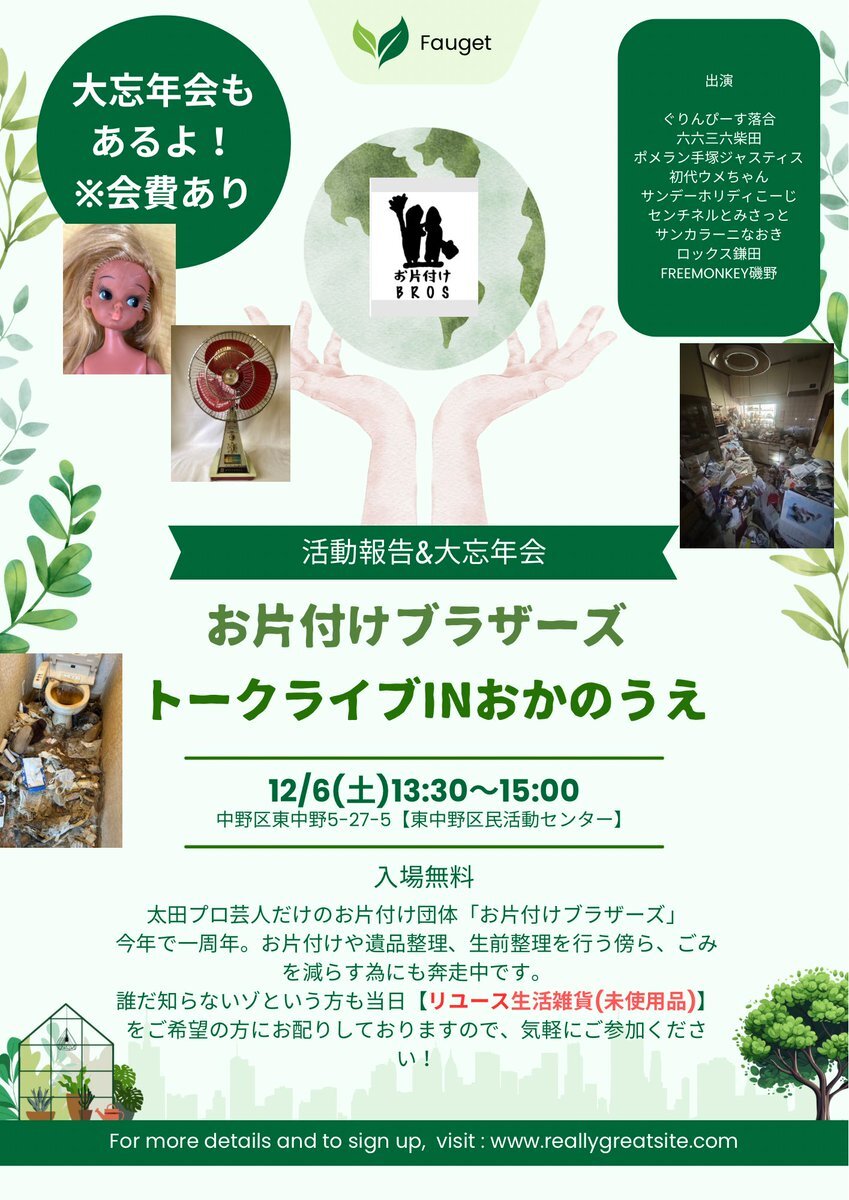ついに行われます! 12/6(土)13:30〜15:00 「お片付けブラザーズトークライブinおかのうえ」 東中野区民活動センター で、開催されます! その後、徒歩2分のマシンガンズ記念館にて大忘年会も行います! 皆様こぞってご参加くださいー!