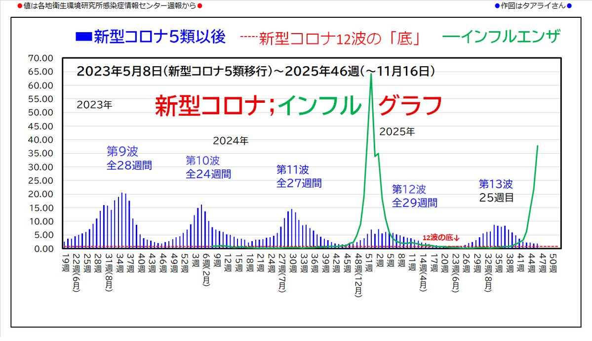 📌独自(=2025.11.21現在):新型コロナグラフ ✅13波、微減(46週=1.91人;前週1.95人) ⚠️12波の底は0.84人 🔄インフル爆増中 ⚠️#マスク必携 #マスク着用 ☑️グラフ:5類以後全期間=9波~13波(2023年第19週~2025年第46週) 📌第13波=感染爆発後21週経過(全25週経過) pic.x.com/EHoJegLmPI