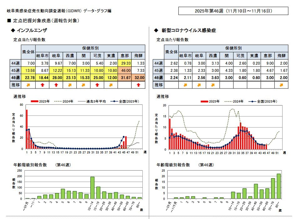 📢速報 感染症週報 #マスク常備 #マスク着用 【46週㊳=11月10日~16日(20日公表)ぎふ県】 △新型コロナ定点当(前週2.38人)2.24人⤵️0.94倍🍀 △インフル定点当(前週13.58人)22.78人🆘⤴️1.68倍 ✅前週値は前週時 ✅感染症情報センター pic.x.com/QSxtX20dWt