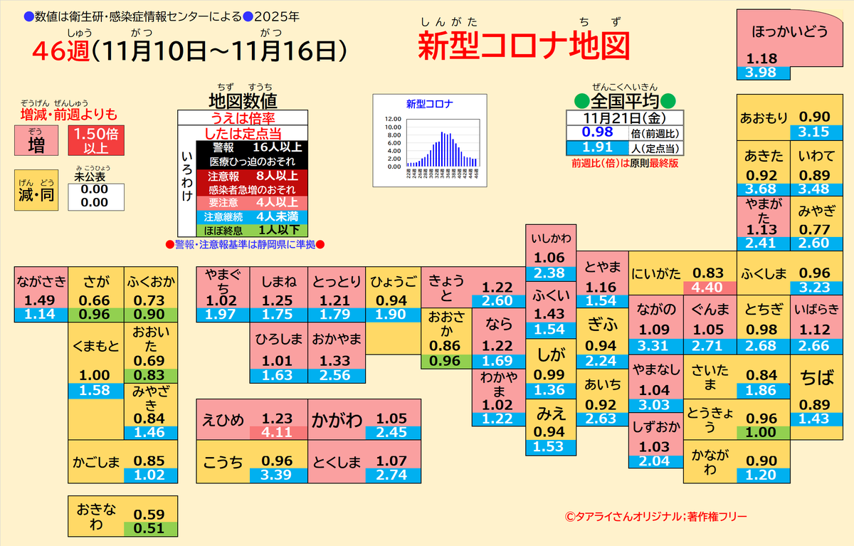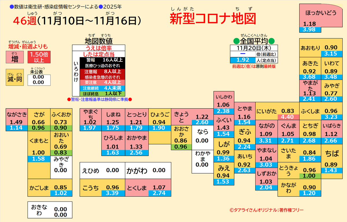 【📌独自】新型コロナ地図⚡️増減混在⚡️ #マスク必携 #マスク着用 ▲11月21日(金)《46週・最終版》 ▲46週=11月10日~16日 △前週比増=22道府県 △前週比=0.98倍(前週=0.86倍) △定点当=1.91人 △8人以上=ゼロ △4人以上=2県 △1人超=39道府県 △1人以下=6都府県🍀 ☑️感染症情報センター pic.x.com/Mkp27N33kI