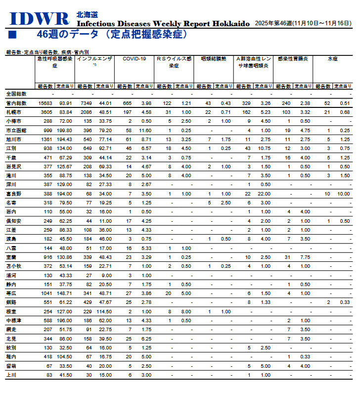 📢速報 感染症週報 #マスク常備 #マスク着用 【46週㉖-2=11月10日~16日(21日公表)ほっかい道】 △インフル定点当(前週28.20人)44.01人🆘🆘⤴️1.56倍 ✅前週値は前週時 ✅感染症情報センター pic.x.com/eTNbghqKY5