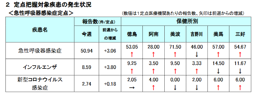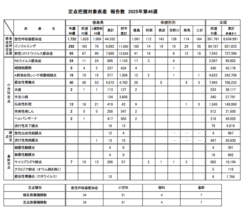 📢速報 感染症週報 #マスク常備 #マスク着用 【46週㊶=11月10日~16日(20日公表)とくしま県】 △新型コロナ定点当(前週2.56人)2.74人⤴️1.07倍 △インフル定点当(前週4.79人)8.59人⚠️⤴️1.79倍 ✅前週値は前週時 ✅感染症情報センター pic.x.com/JTndjfjyMi