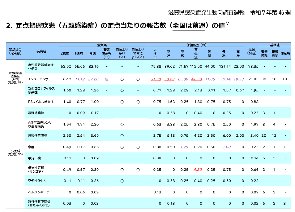 📢速報 感染症週報 #マスク常備 #マスク着用 【46週㊵=11月10日~16日(20日公表)しが県】 △新型コロナ定点当(前週1.38人)1.36人⤵️0.99倍🍀 △インフル定点当(前週11.12人)27.28人🆘⤴️2.45倍 ✅前週値は前週時 ✅感染症情報センター pic.x.com/lvLnsQ93z0