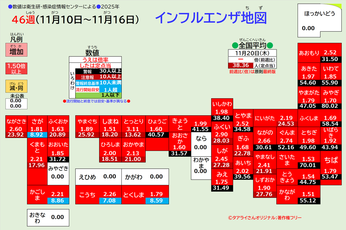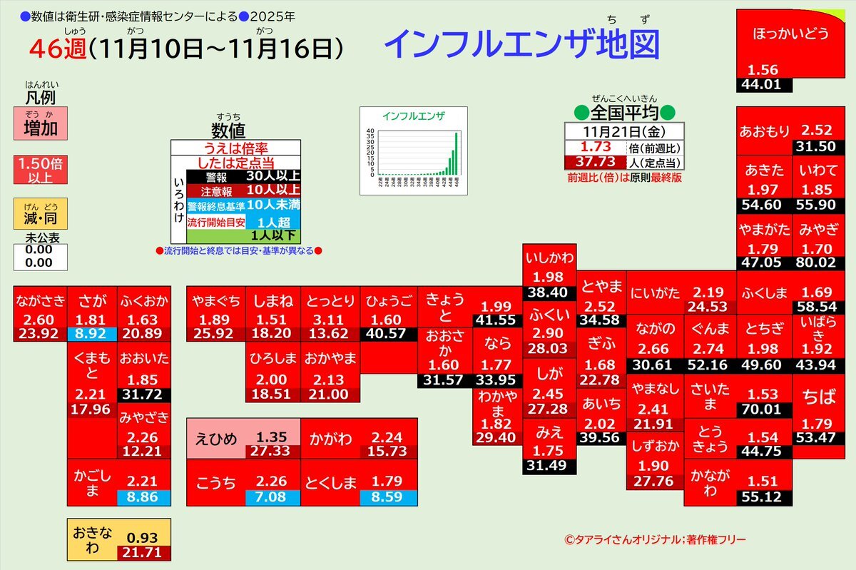 【📌独自】インフルエンザ地図🆘爆増🆘 #マスク必携 #マスク着用 ▲11月21日(金)《46週・最終版 ▲46週=11月10日~16日 △前週比増=46都道府県 △前週比=1.73倍(前週1.46倍 △定点当=37.73人🆘🆘 △30人以上=24都道府県🆘🆘警報 △10人以上=19県🆘注意報 △1人超=4県 ☑️感染症情報センター pic.x.com/nfxwoiDonR