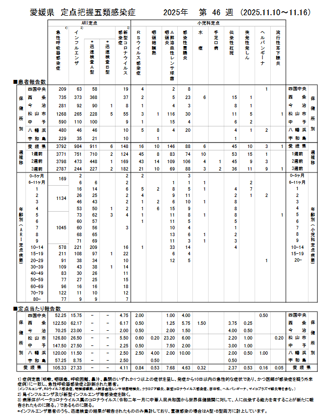 📢速報 感染症週報 #マスク常備 #マスク着用 【46週㊼=11月10日~16日(21日公表)えひめ県】 △新型コロナ定点当(前週3.35人)4.11人⤴️1.23倍 △インフル定点当(前週20.30人)27.33人🆘⤴️1.35倍 ✅前週値は前週時 ✅感染症情報センター pic.x.com/BjiwNcBnfV
