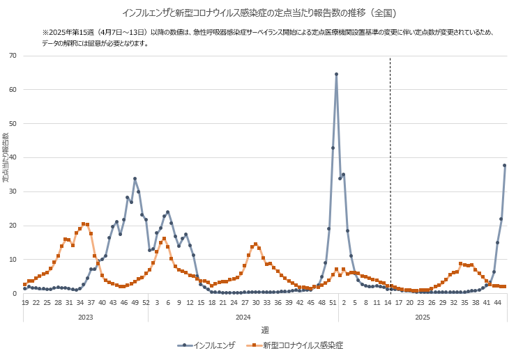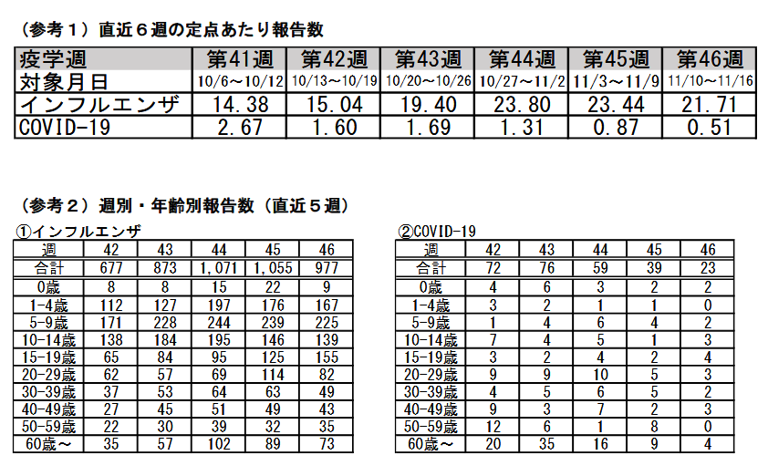 【#インフルエンザ の流行が拡大しています】 第46週(11/10~16)の定点当たり報告数はインフルエンザ 37.73(前週 21.82) 新型コロナ 1.91(前週 1.95) でした。 一人一人が手洗い、咳エチケット、換気などの感染対策を心がけましょう! mhlw.go.jp/stf/seisakunit…