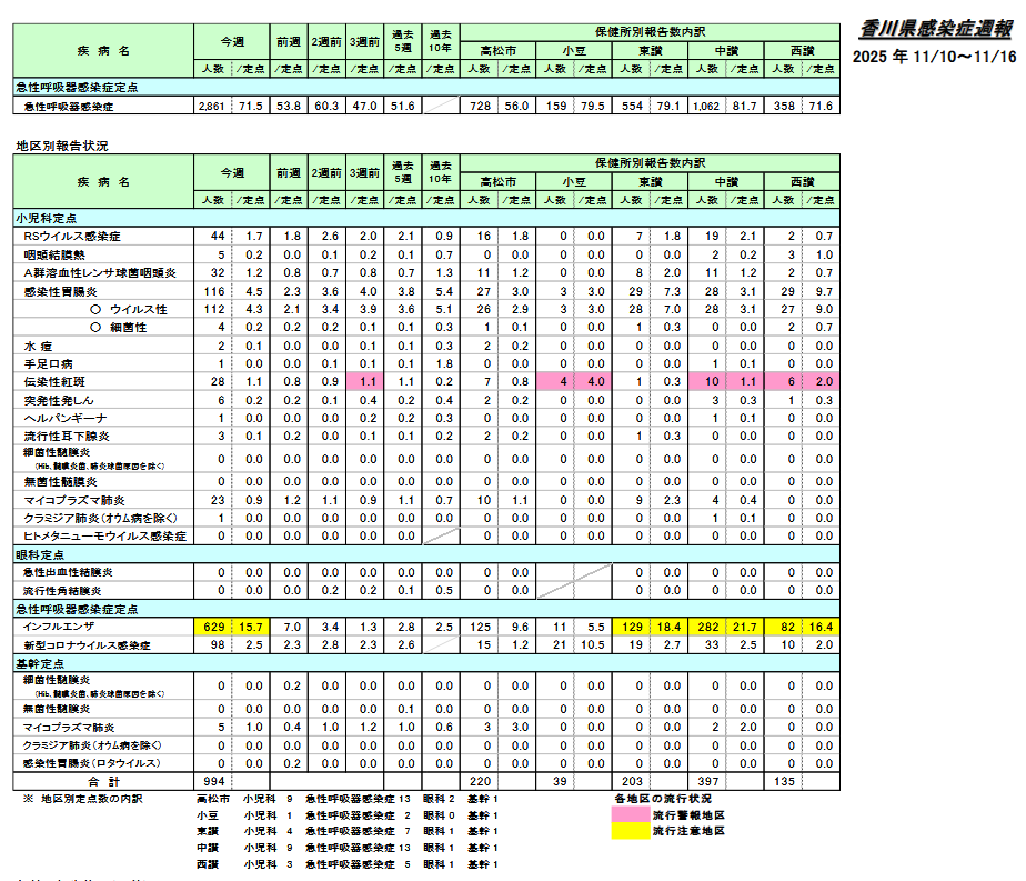 📢速報 感染症週報 #マスク常備 #マスク着用 【46週㊻=11月10日~16日(21日公表)かがわ県】 △新型コロナ定点当(前週2.33人)2.45人⤴️1.05倍 △インフル定点当(前週7.03人)15.73人🆘⤴️2.24倍 ✅前週値は前週時 ✅感染症情報センター pic.x.com/1S51DnP05m