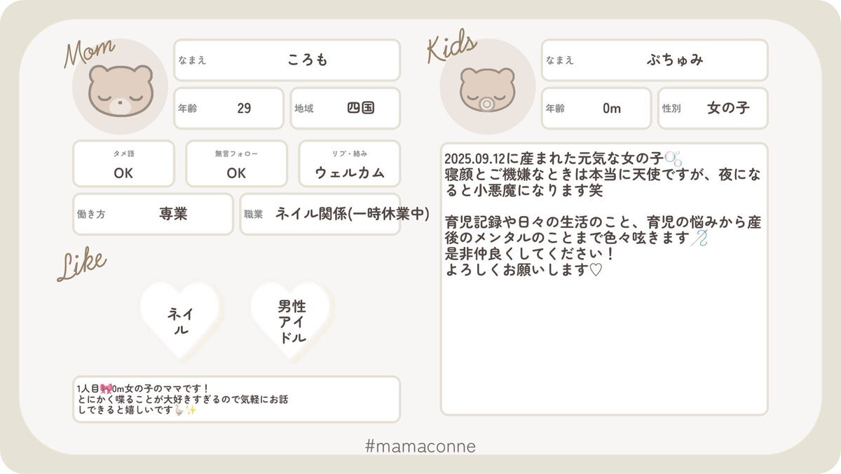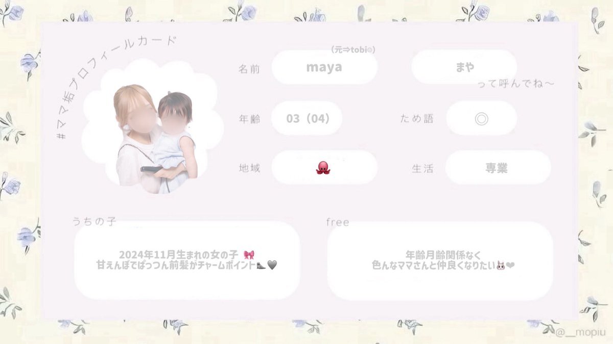 ママ垢はじめました(。 ◡ ⩊ ◡ 。)💘 かわいいもの共有や色々なお話したいです🐹🩵 いいねでお迎え行きます💌💭仲良くしてください♡ #ママ垢さんと繋がりたい #ママ垢プロフィールカード #ママ垢プロフィール