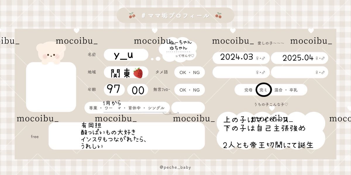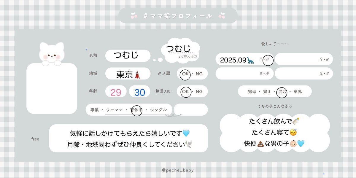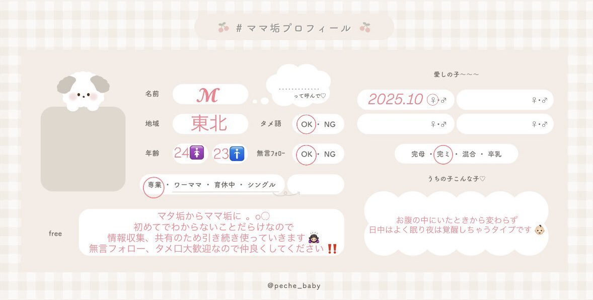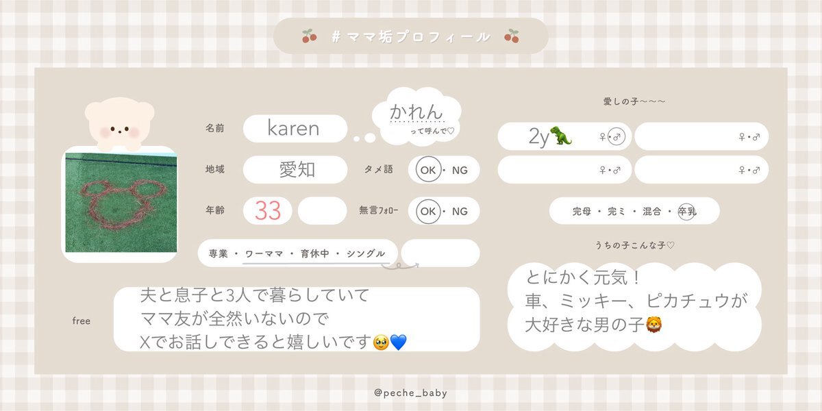 マタ垢からママ垢になったので ꈍ .̮ ꈍ 呼びタメ、無言フォロー大歓迎です 🫂 年齢、地域問わず仲良くしてください🤏 ※ママ垢ルールわかりません※ #ママ垢 #ママ垢プロフィールカード #ママ垢さんと繋がりたい pic.x.com/t1RePpk04f