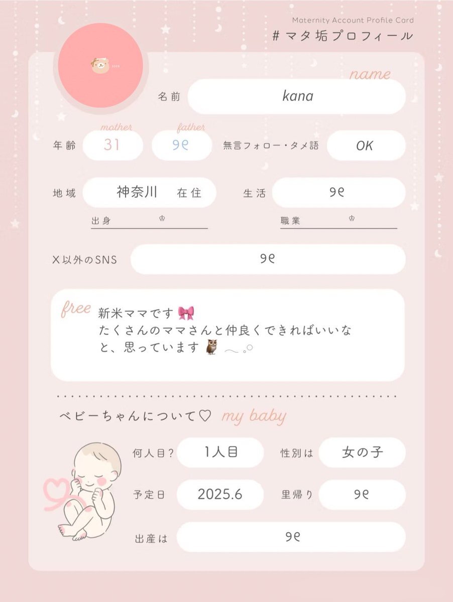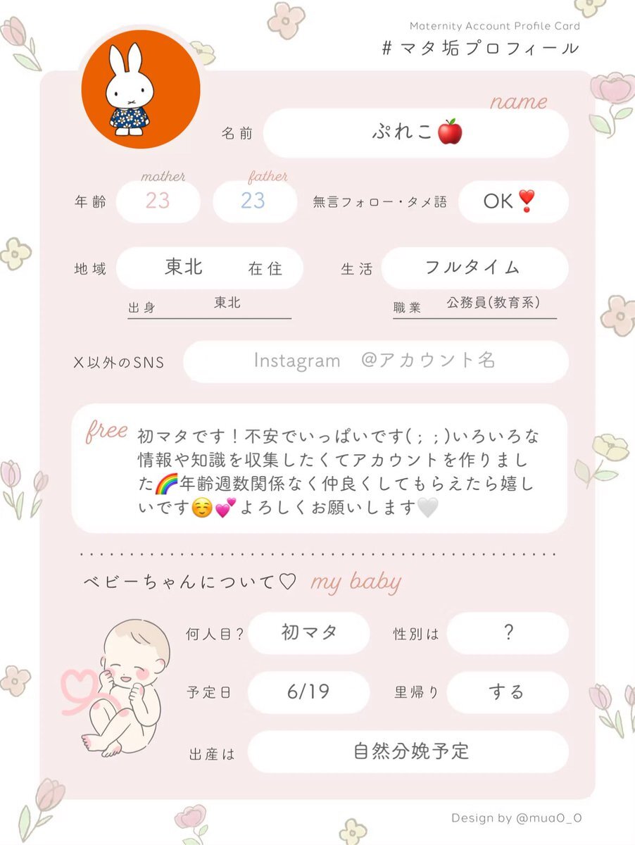 マタ垢プロフィール作りました🐰 ♡でお迎えにいきます💁‍♀️ 無言フォローも大歓迎です😭💕 年齢近い方、週数近い方 どなたでもぜひ仲良くしてください🌈 #マタ垢プロフィール #マタ垢プロフィールカード #マタ垢さんと繋がりたい #ママ垢さんと繋がりたい pic.x.com/ejp6RiOjQN
