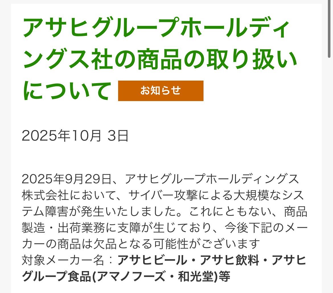 今朝ニュース見てて 和光堂はアサヒグループだから 今回のサイバー攻撃で発注できない状況みたい😭💦 離乳食で助かってるママ達も多いし 早く復旧してくれるといいな😭! #アサヒグループ #和光堂 #ママ垢さんと繋がりたい pic.x.com/8g8QWd6QwE